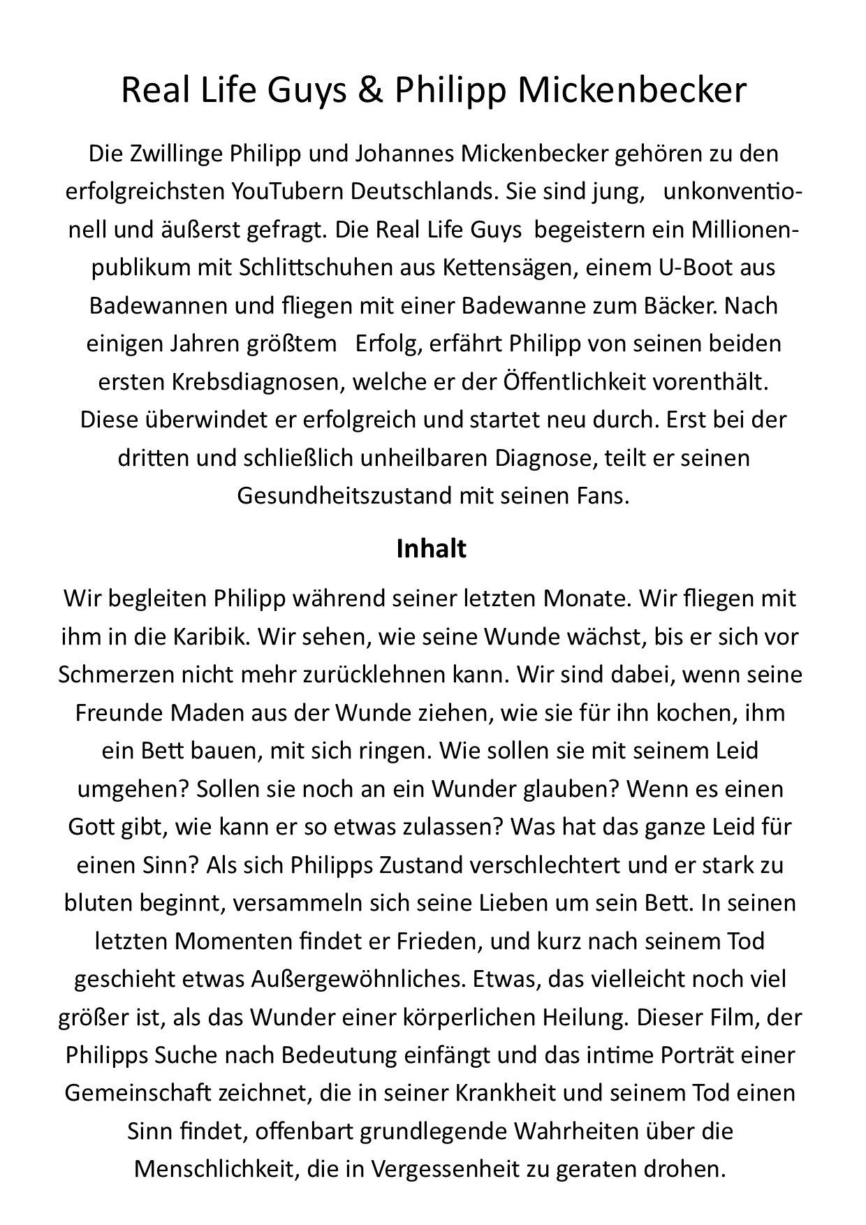 Der YouTuber Philipp Mickenbecker baut mit den Real Life Guys nicht nur fliegende Badewannen, U-Boote und eine Achterbahn im Baumarkt, sondern wird zur lebenden Legende im Internet und schart Millionen von Anhänger hinter sich. Auf dem Höhepunkt seines Erfolgs erfährt er von seiner Krebsdiagnose und ist davon überzeugt, dass Gott ihn heilen wird. Wir begleiten Philipp und seine Freunde während der letzten drei Monate seines Lebens.